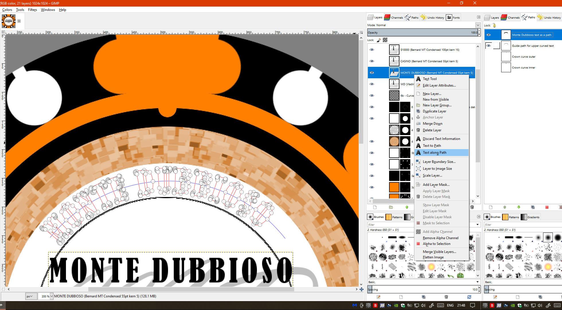 Now I have to remember how to turn that newly created text-as-path path into a nicely anti-aliased chunk of curved text. I think I did a Stroke Path with an antialised 1 or 2 pixel brush to give me the antialiased edges, then did another Stroke Path on a different layer with a soild, un-anti-aliased 1 pixel brush to give me a solid outline to fill. Then I selected the area enclosed by the solid outlined bit, and then did a bucket fill on the aliased outline layer. I'm sure there's an easier, better, far more sensible way to do it, but where's the fun in doing sensible things ?