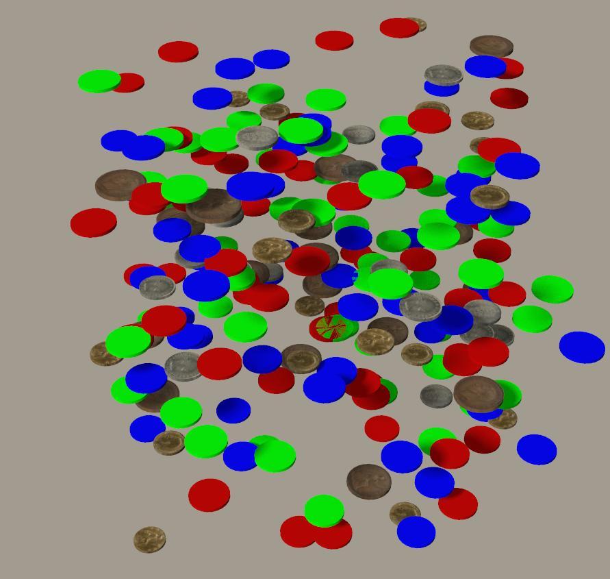 First a render of 216 non-intersecting* coins** within a very small space, using the Set A, B, C, and D positions and random rotations.