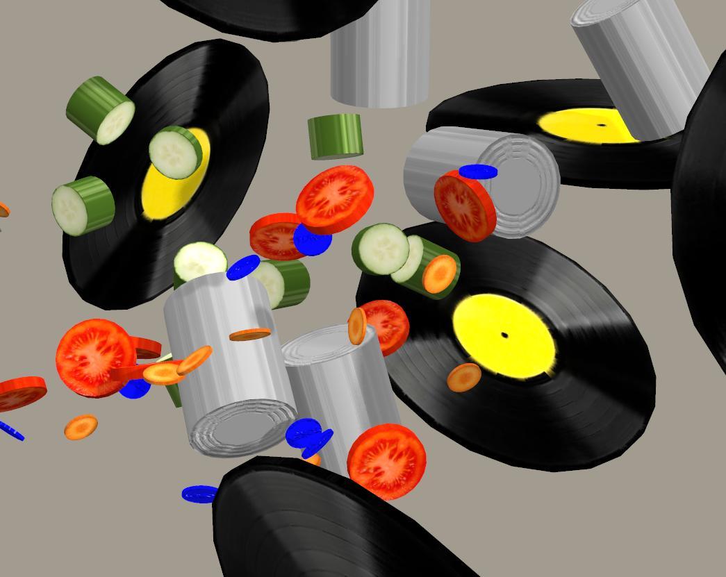 Both of the above renders were without any subd/smoothing. The later one shows some of the many flaws. Still, that's what you get for throwing badly chopped veggies, records and unlabelled cans in the air.