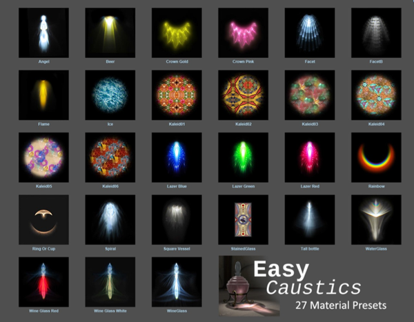 Caustics can be difficult to produce or set up realistically from scratch in your scenes. This product aims to help you produce more realistic glass and liquids using the enclosed special light rigs. There are 28 different material options to create different caustic looks, from the appearance of light reflected from metal to cast through clear liquids to colorful stained glass.
