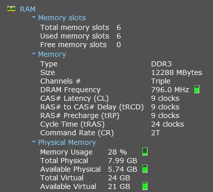 I think all of the sticks are working because E-LEET and CPU-Z are both showing 12 GB total, Windows even shows 12 GB installed too, but then says there's only 7.99 in total physical memory available with 5.49 free. Could someone refresh my memory as to where memory settings can be adjusted in Win 7? Maybe I did something early on to set aside that memory.