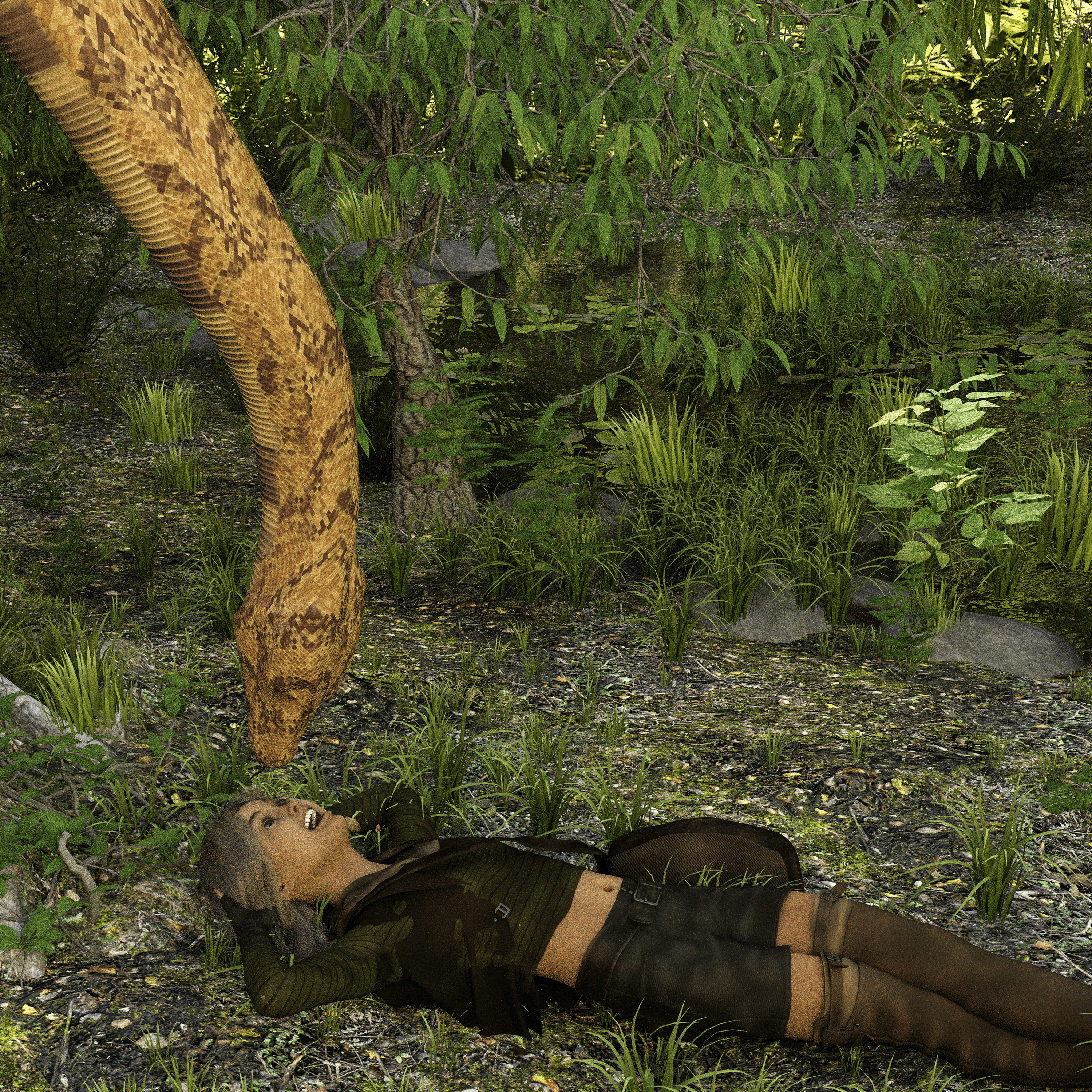 Considering it's the horizontal woman that has her mouth open it might be the poor snake that is in trouble?