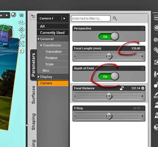 - in the Parameters tab adjust Focal Distance & F/Stop.