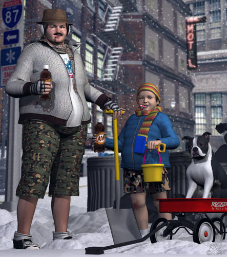 Hey dere! Anybody here tired udda snow yet? Jeeze, yeah, me too. We've been hip deep innit since Christmas an' I'm gittin' tired'a doin' alla dis diggin' every mornin'. Ya sees, it's a city law dat we gotta keeps da sidewalks clear in front o' our "places'a residence" in case'a 'mergencies 'n' stuff. Yeah, da only 'mergency I gots is shovelin' out a spot fer dat @#%$! mutt Boston t' do his business in da mornin'...an' even den I gots't clean up afta' 'im! Oh, hey! Dis is my li'l nephew Oskar, me middle brudda's kid. He likes t' come over when he's outta school...which seems t' be about every damn day...and he helps me wit da shovelin'. As youse guys knows, I don't do no drinkin' or smokin' 'round no kids soes me 'n' li'l Oskar we goes down t' da corner market where I springs fer a couple o' root beers an' a couple o' peppermint sticks t' snacks on while he's woirkin'. It's a pretty good deal dat costes me a couple o' bucks, he gits lunch (which I promiced his mudder I'd get for 'im), and I gits my sidewalk cleaned! Dat saves me a $50 fine fer not keepin' da sidewalk clean, plus it saves me anudda' fifty bucks t' have some goof in da neighborhood to do it instead. Now I understands why people wants go an' have kids! It's free labor! Not dat I wanna go out an' have any for myself, y'understands...I kin takes root beer and peppermint sticks for only so long...