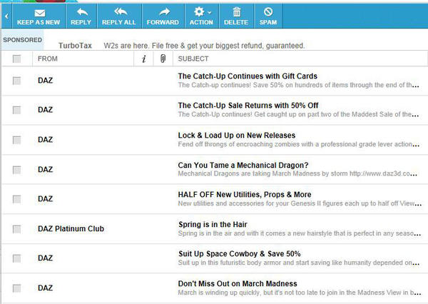 ....one of the reasons I have all but quit coming to the Daz site....todays emails in my box!!!!!