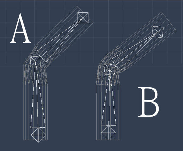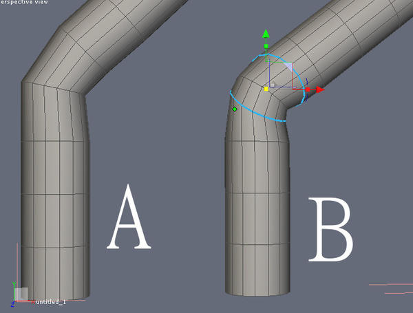 A simple illustration of how mesh construction can effect deformation. In the first pic, I have cut in two extra edge loops and angled them so that when they deform using bones, they don't bunch up. The second shows the difference in Carrara - A without the extra edge loop and B with it. Because wireframe doesn't show up well in Carrara, the third pic shows this off better in Hex.