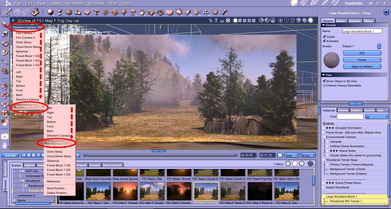 When I drag in the Larger Woodland block, I don't see it because I'm actually underneath it. So I use my Director Camera and, with that Large block selected, I type the number 0, which backs the camera off so that I can see the whole thing. Now I move the thing to a position where I'll be able to manipulate it from within the camera I want to render with.