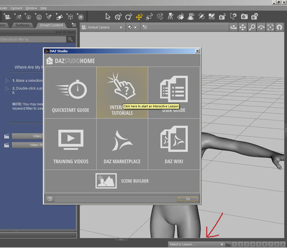 Finding tutorials and other help files for DAZ Studio is the easiest that it has ever been. Clicking on Help > Home brings up the screen shown below, and there is also a lesson strip at the bottom of the interface which also leads to the Barefoot dancer tutorial.