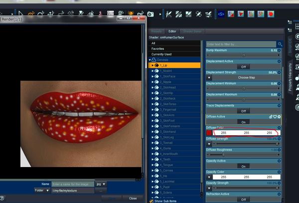 in lip surface of diffuse texture. then keep difuse color=white.