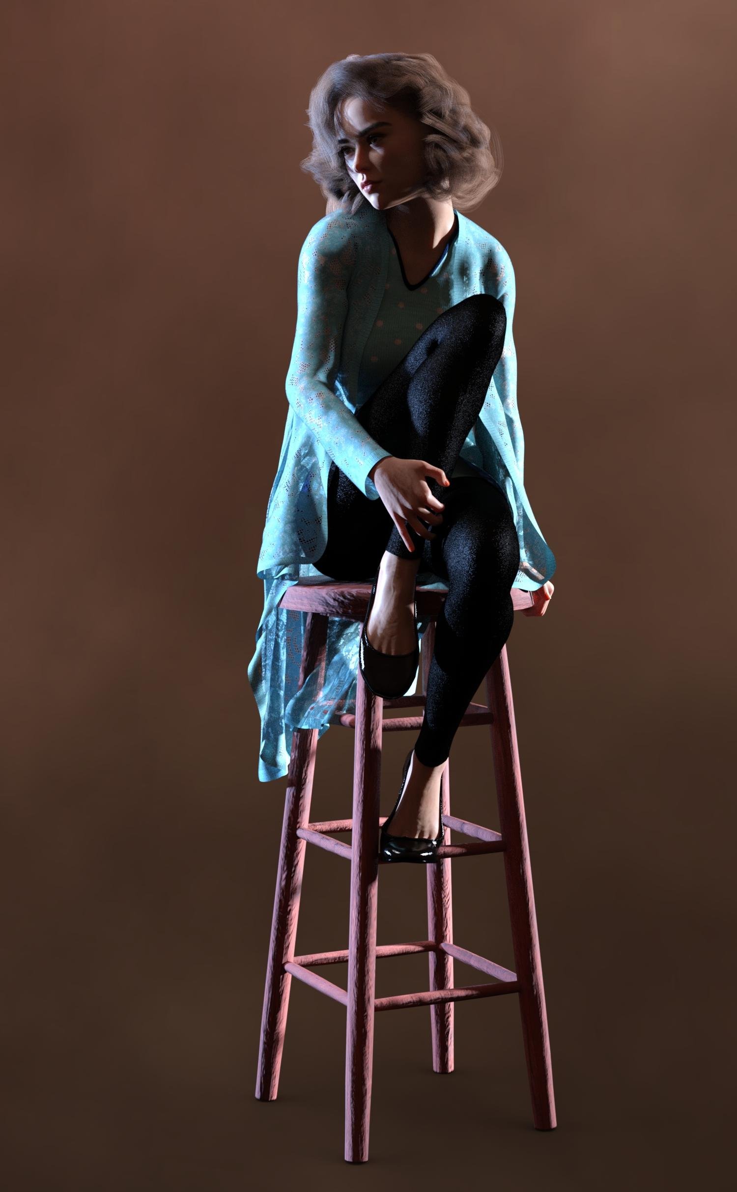 While I have been posting renders around various threads using these poses, it has been a bit since I posted one here. I have Dior sitting on the bar stool, using ASP Pose 004 and she is in the Courtney Outfit and Ballet Flats, with the new Ingrid Hair by AprilYSH. This required a tad of shifting of the stool and that was all, along with multiple simulations, freezing the top, then the sweater. Although the hair is dForce, I just let it hide and then do what it wanted. (I had tried all three together and got a marvelous explosion!) I lit it with Perfect Portrait Lights and got a mysterious touch that I liked. Reminded me of 40s Stars in Jazz Bars.