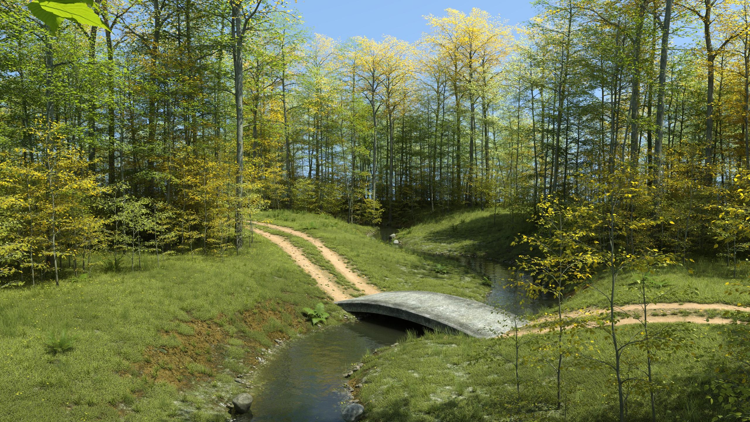 Thank you all for the comments! Many of these comments and the images people are posting are inspiring me to try new things. The mention of bridges, and @kervala talking about the road along the river resulted in this image.