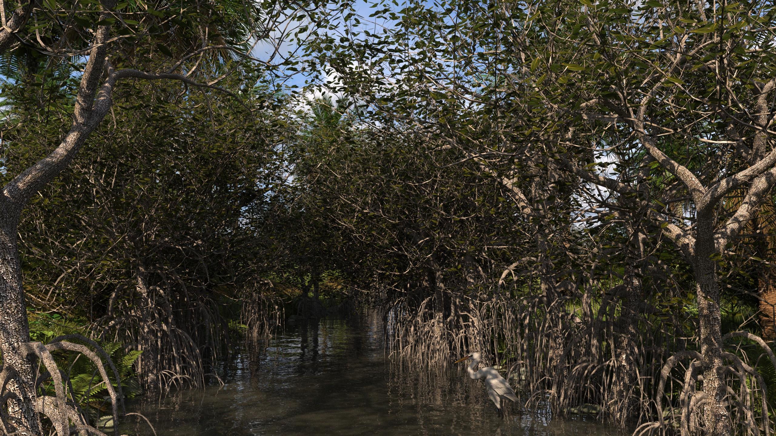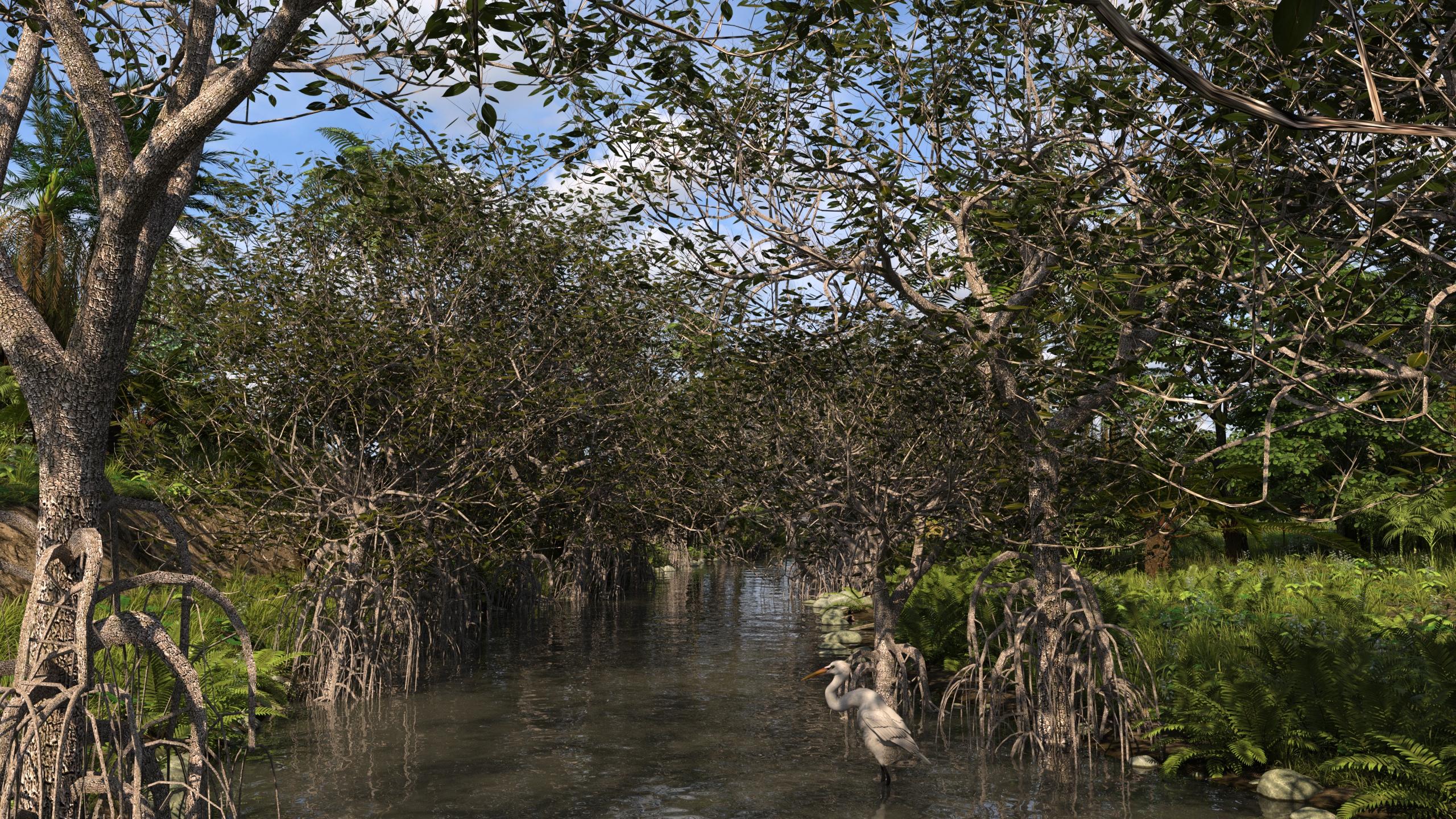The mangroves are pretty interesting, but they truly are low resolution as advertised. They don't respond well to subD either. They get weird artifacts between the root part of the trunk and the upper part of the trunk, so I stuck to the low res version. Here are some USC images generated with a quick mangrove ecology I threw together. They are all the same ecology, just a different build seed. They use the muddy river water.