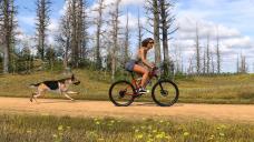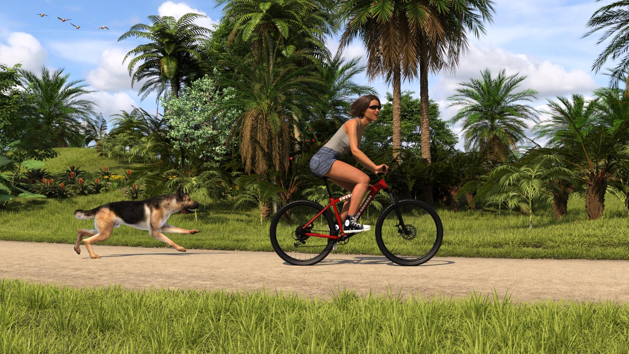 Here's the same scene with my Olives Ecology. It is fun to see how the same scene looks with different vegetation. I had to use Scene Optimizer on this one. It turns out that both the bicycle and the hair have 8K textures. That, along with all of the various plants, added up to a bit more than my graphics card could handle with my render settings. The dog is just a billboard, so he didn't take up much memory. If I had used the real 3D German shepherd with dForce fur, it would be a no-go for sure.