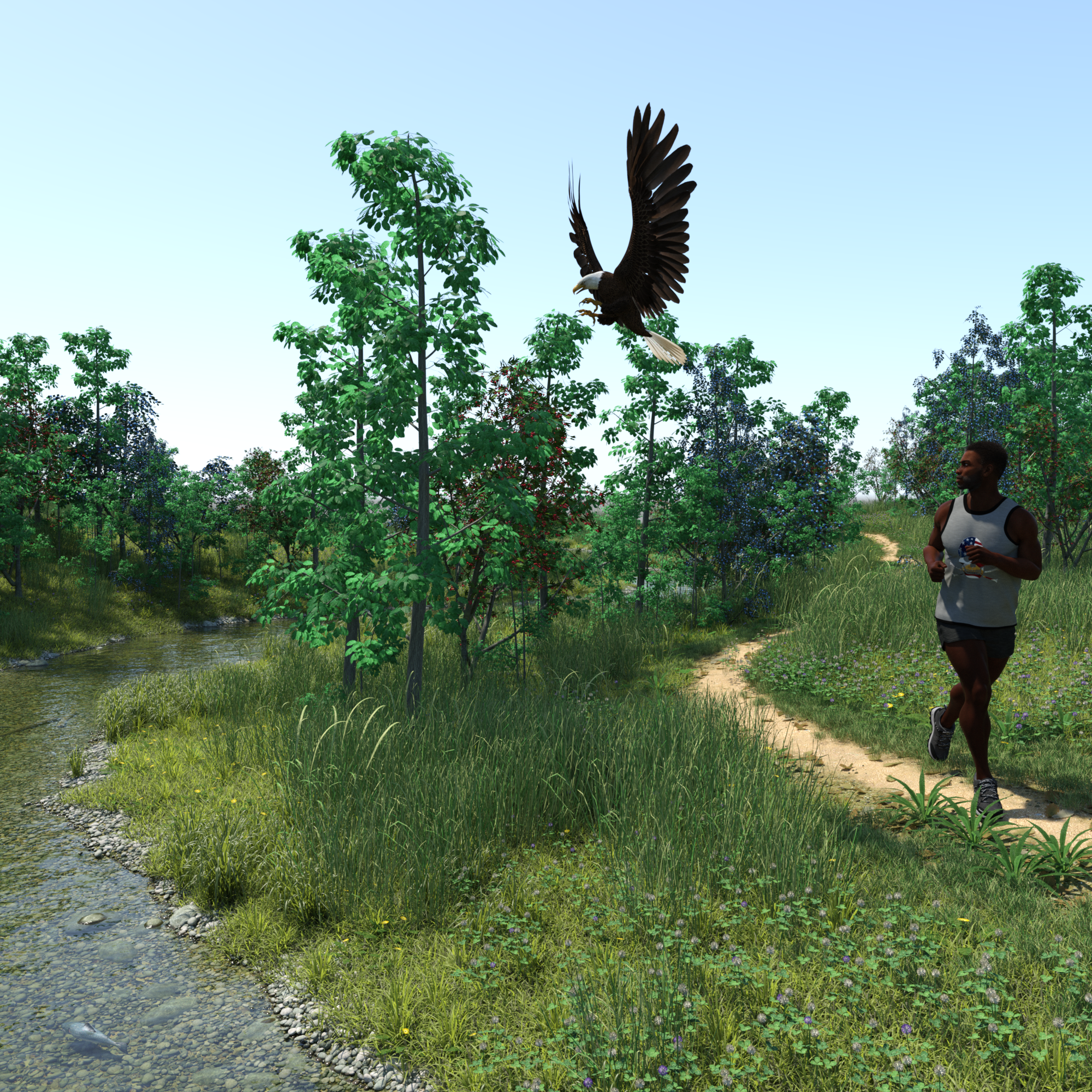 I managed to get a bit of time to try out UltraScenery's new toys. I used River 3, Tangy Apple Orchard 13, and Clean Stream for the water. I have a new character, Khalan running and Deepsea's Eagle about to snatch breakfast from the stream. I love how the magic (science) works to bring joy to my heart. It took my computer about 17 minutes to build, and about that to render.