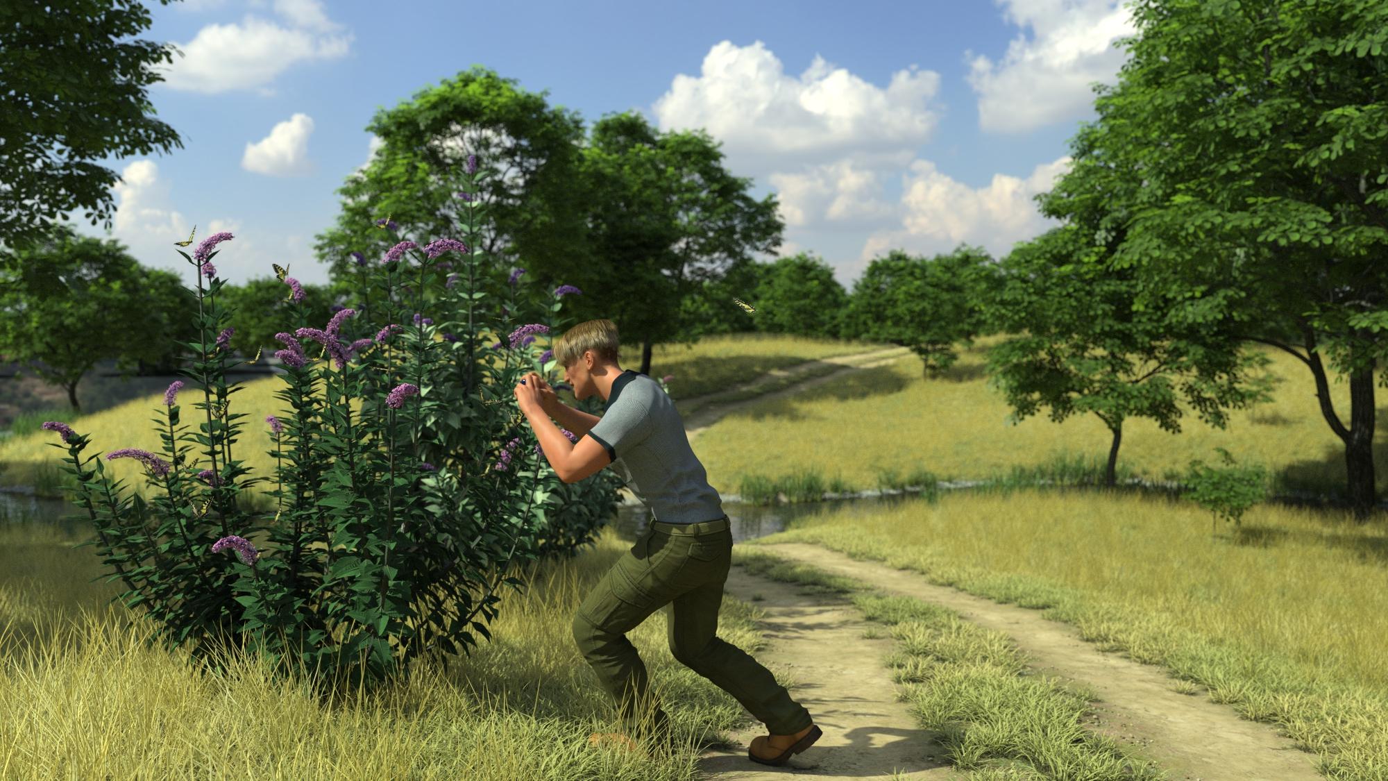 I'm exploring Gogger's suggestions for what people can do in a scene. Here we have a guy photographing butterflies. Yes, I know they are hard to see, but they are there. wink I added them with UltraScatterPro. I added the buddleia bushes manually.