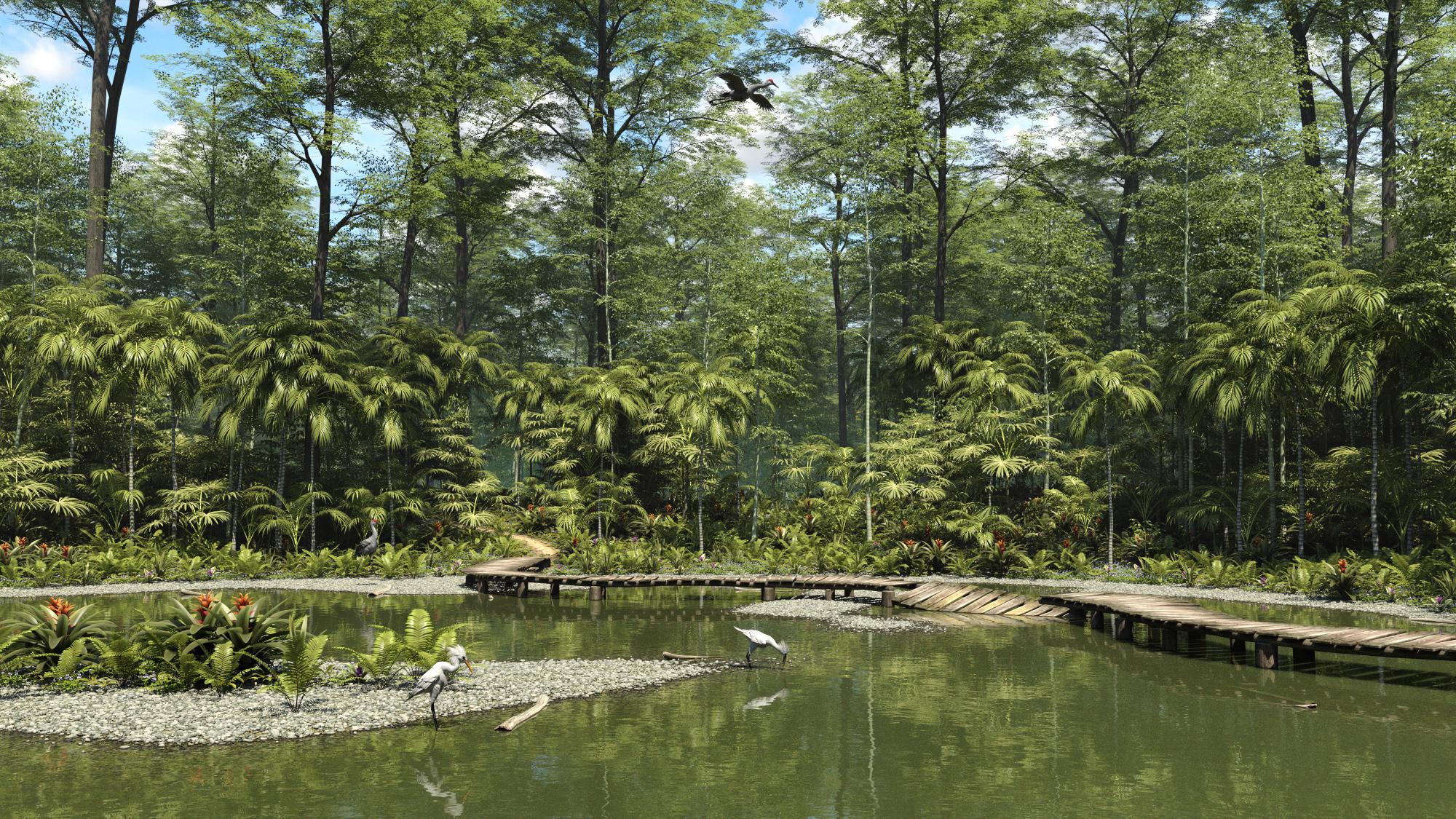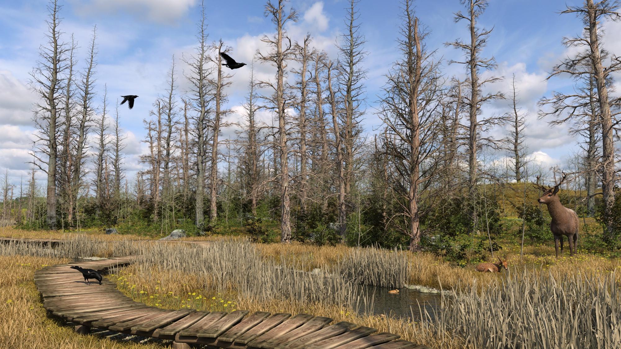 Since I'm from Florida, the Wetlands 2 and Mossy Hollow 1 make a good combo for me. I added some birds, "broke" a piece of the boardwalk by rotating it, and turned on Matte Fog.