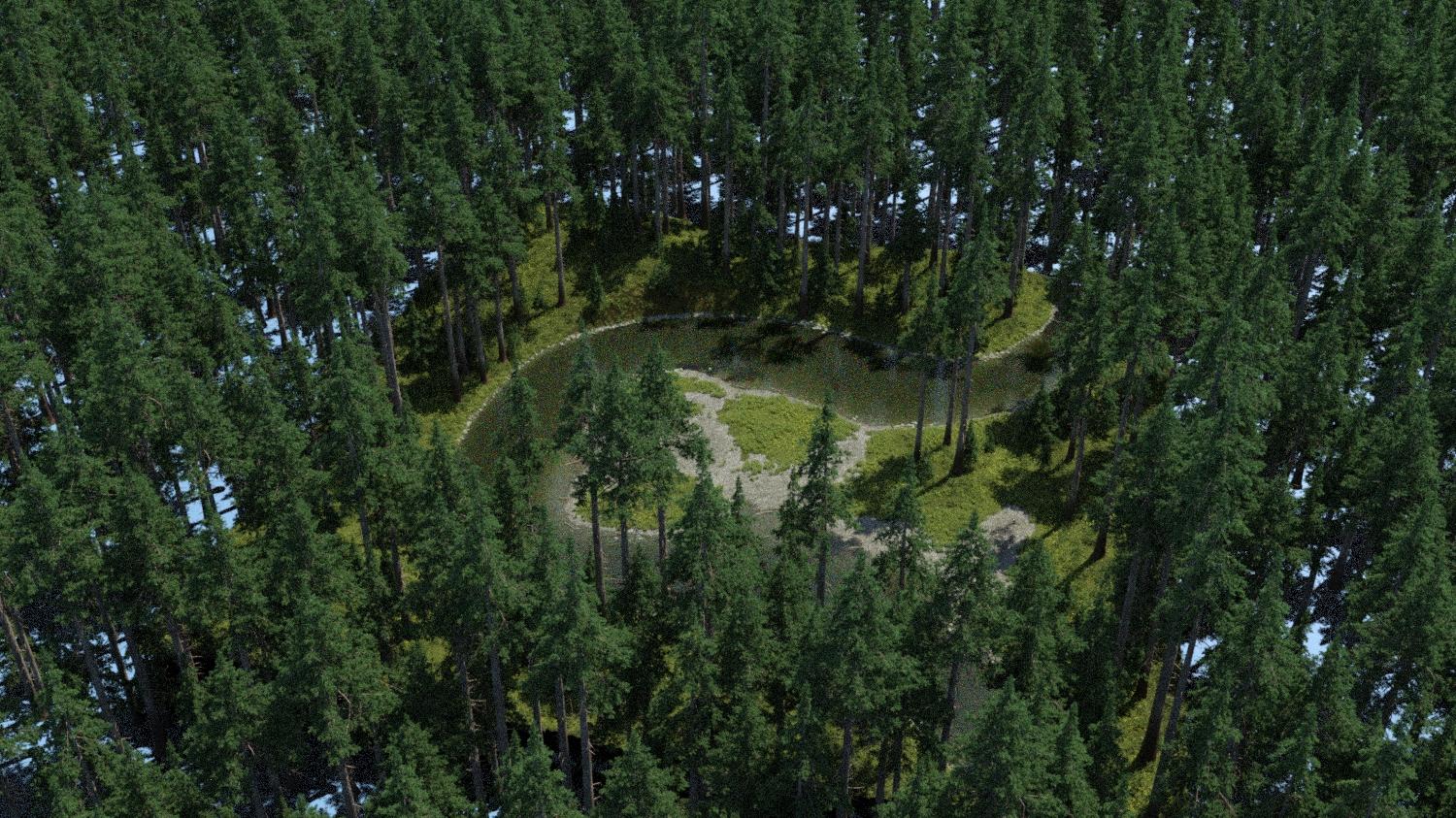 This is Lake 2 and Pines 1 with "extend forest" selected, as I didn't know what you selected. My observation about the items that are at -300 Y and 1% scale is that they are only the objects that were the source for the instances. So they are well hidden from the scene, which makes sense. Even the river logs, grass, etc. If you select any of the instances though, they are not set below Y and they are regular scale.