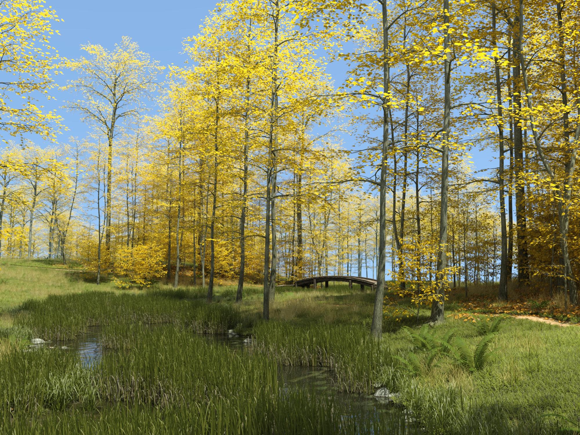It would be great to have some winter, snowy ecologies, but you can make winter scenes with UltraScenery. Just generate your scene and then apply geometry shells and snow shaders. They don't look totally authentic, but good enough for me. I made this with River 5 and Oaks 4. I only have a GTX 980Ti (6GB), but it is totally possible to add extra things to an UltraScenery scene.