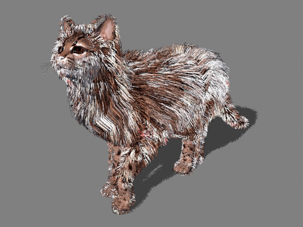 here is a kitty with a quantity of 160000 hairs at half complexity. The triangle count was just over 1 million this way. I cut down the amount of hairs from the original 700k or for performance reasons. Going to see if I can squeeze a few more hairs in there. Both octane and daz studio only needed about 1.1-1.3 gigs of ram so I have some room to play.