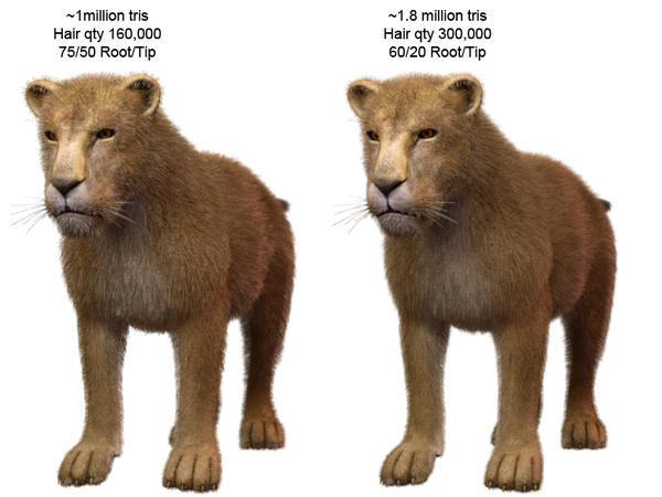 here's more lion updates, I reduced the root and tip some more and upped the qty of hair. With 300k hair in OBJ format daz is at 2.4 gigs of ram. when daz is exporting to obj that climbs to 4 gigs.