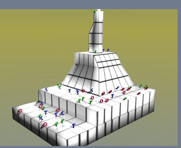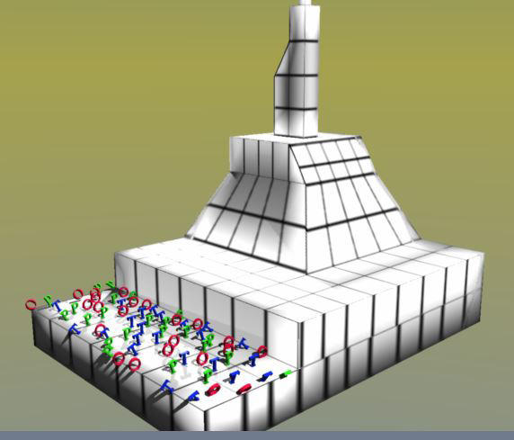 First, we have to assemble the ingredients. We need something to replicate the objects on, and we need some objects to be replicated. I've made a quick vertex object that sort of looks like a lighthouse or a fancy temple. For our purposes, the important thing is that it has a variety of flat and sloped surfaces at different elevations. I have divided the lighthouse into a number of shading domains, and then used the uvmapping function in the modeling room to assign the domains to different regions on the uvmap. That map will be relatively easy to edit in photoshop. For visual effect, I have applied the uvmap back on the model of the lighthouse just so you get a sense of its mesh.