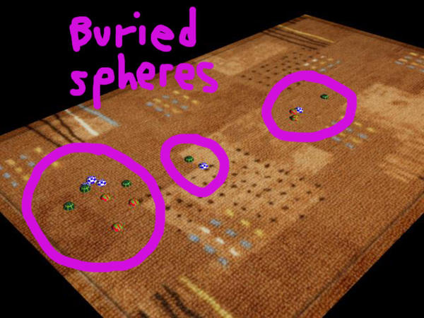 Wait! The marbles are half buried in the rug! That is because the spheres loaded with the hot point in the center by default. I will correct this, and explore the parameters for more detailed distribution controls in the next post.
