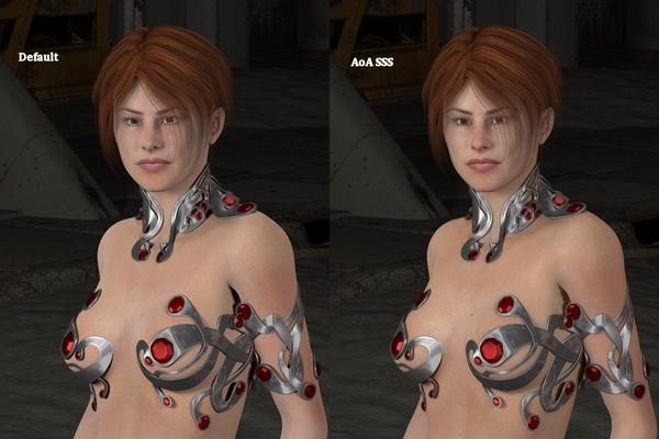 Out of curiosity I wanted to see what a difference the AoA SSS materials make compared to the materials using the default shader. I re-render the image with the default material. You can see the comparison below. The AoA shader gives a little more pinkish shade to the skin. I have the SSS strength at 75% and the diffusion strength at 58%. The diffusion color is 226,248,255 which is the same as the Default shader material. There is also a touch more specularity because I found the specular textures and setup a modest amount of specularity.