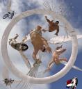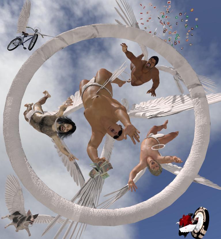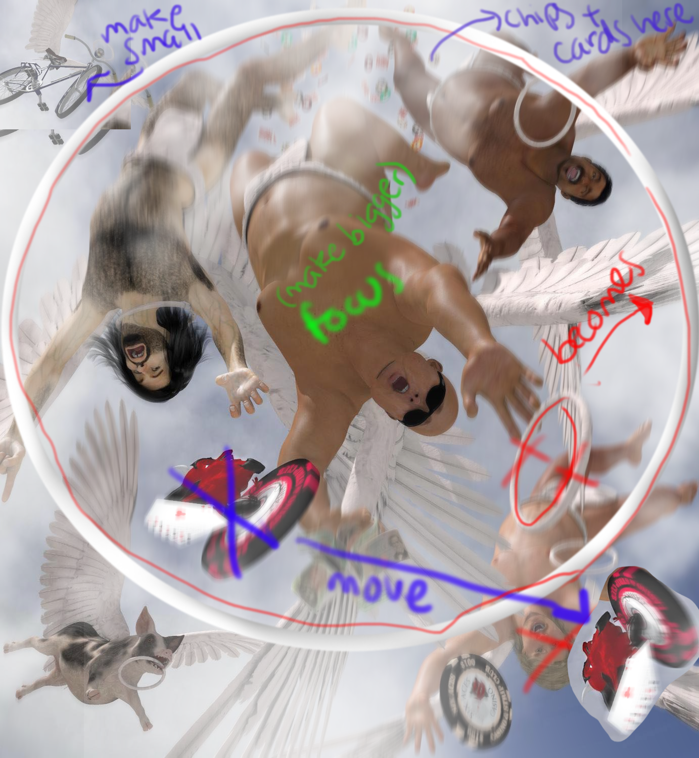 • You could use the halo of your main subject as a way to group the falling angels and separate them from the non-falling and/or non-human objects. Unless you made the other figures smaller, you might need to get rid of one of the falling angels. Or make the render wider so you can have more space. Just remember that even though you're dealing with a group of falling angels, you still need to pick one of them to be your "main star" and then design things around that subject. - moved the main character's halo to be the frame as suggested and zoomed out a bit. Unfortunately the wad of cash and the two foreground chips didn't load with the scene,but I'll sort that out for the next iteration The zooming out allowed the four main characters to fit inside the framing halo. The bald guy seems the obvious main focus (he was the first thing I put in the scene), so his head wass the focal point for the postwork focus-blurh is set to his head.