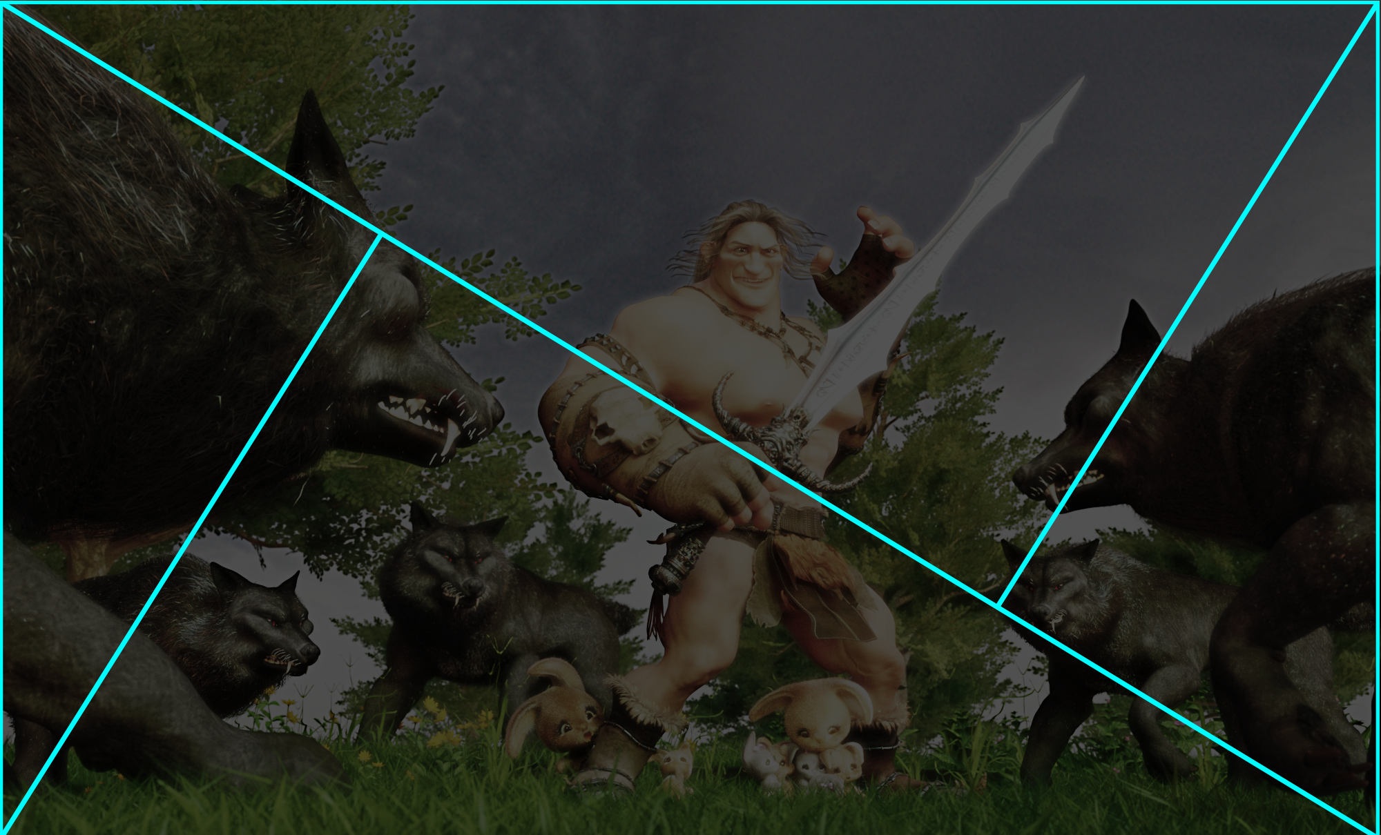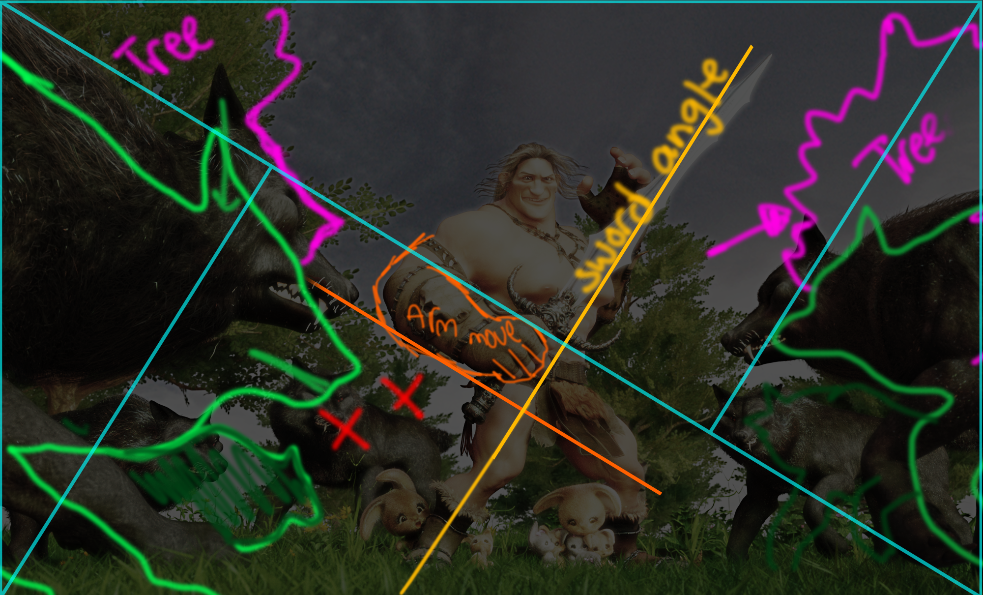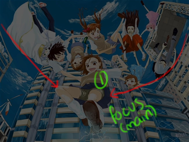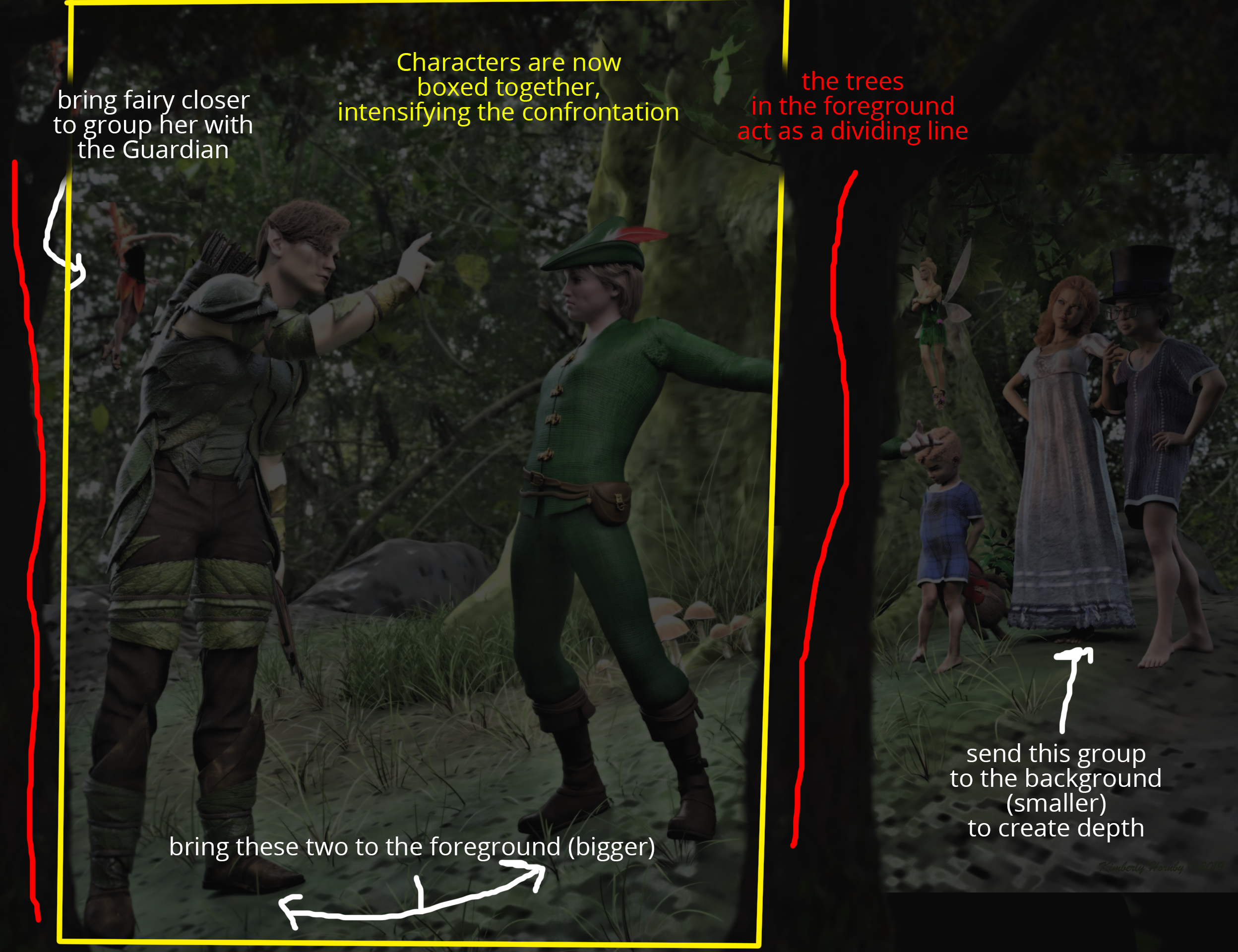 As you can see, these references make use of lines to draw our focus to the main subject. Those lines can be created by the way you position your characters. That in mind, this is a possible way you could approach your design.