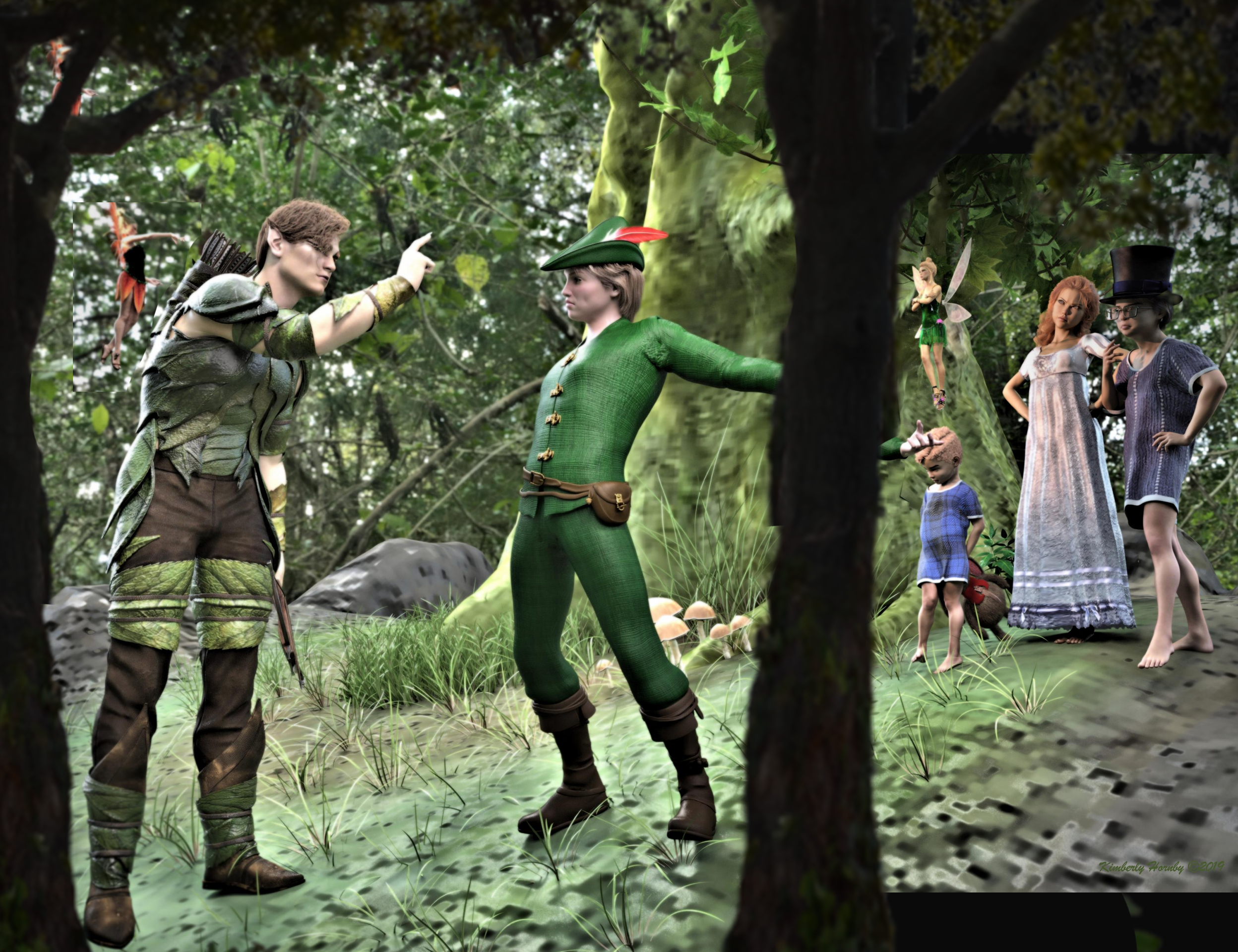 I had to reload the scene I used for the entry a few times in order to find allthe missing files, but I got there. It was easier to start again from that than from the modified scene in my previous post. No depth-of-field focus blur or clouds yet, because I'm trying to get the positioning of the figures correct first.