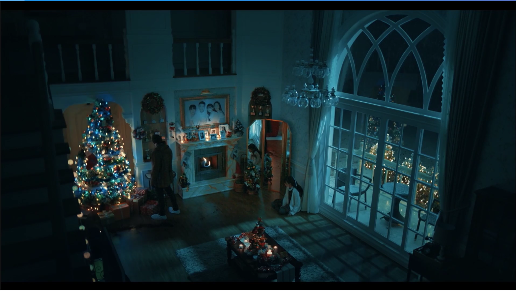 This is a screenshot from the drama Come and Hug Me. Notice how the dim light and the cold temperature contribute to a dark mood despite the Christmas decorations. Of course, in this case, this man has just killed the girl's entire family... so MUCH darker concept. But the importance here is how everything contributes to a sad and scary mood.