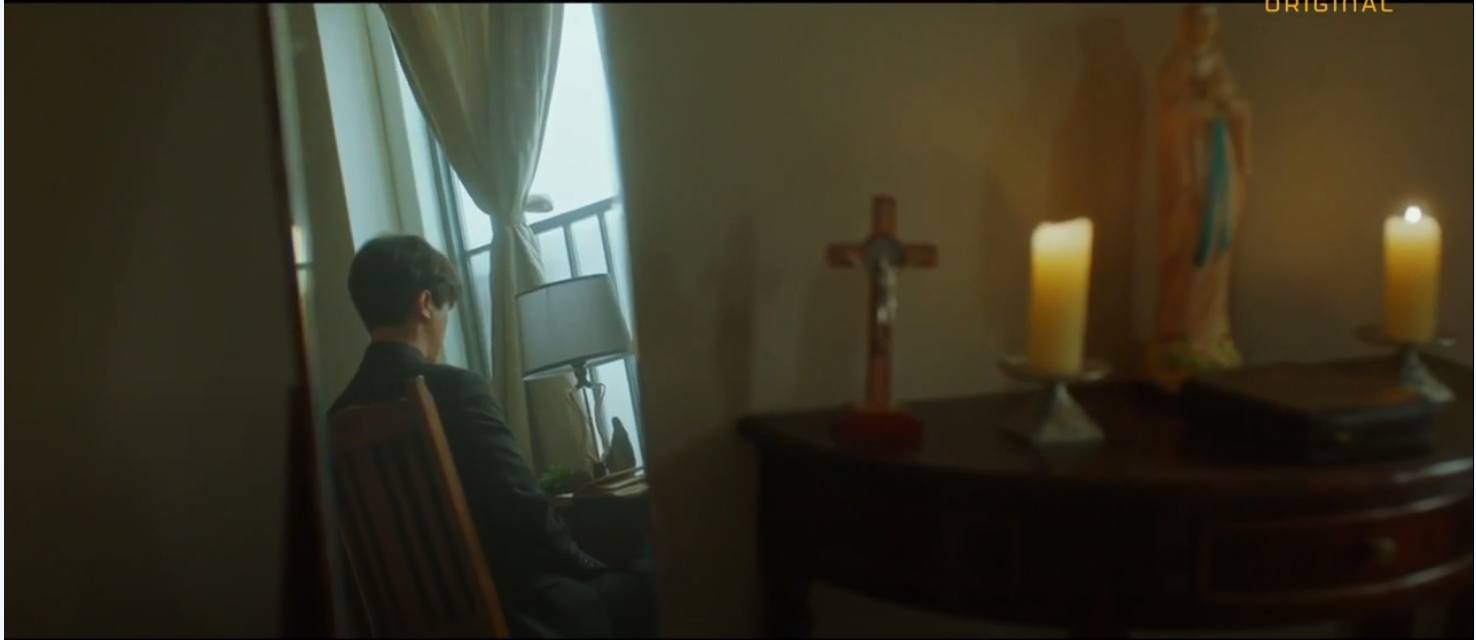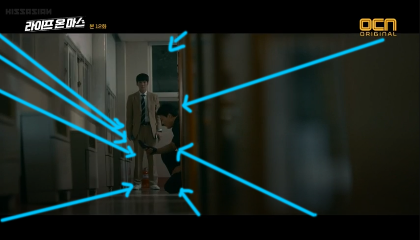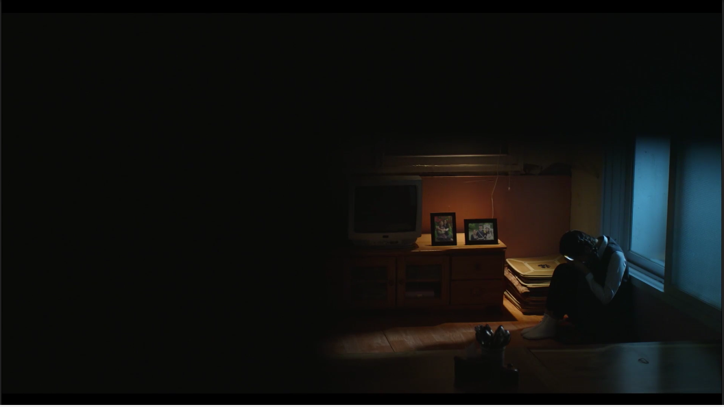 • Another thing that can help you add mood, is to zoom out so your character, framed by the window, becomes a smaller part of the render. In that way, you'll show that he's feeling trapped and isolated. Korean Dramas do this technique (I call it boxing) quite often to showcase a character who's feeling trapped. I wrote an article about the technique showing several examples which you can read here. I'm adding two references (screenshots I took from different dramas) as examples to showcase the boxing technique and how it contributes to a gloomier mood (cold temperature). Notice how the foreground is always quite dark, with whatever is being trapped becomes the focus of the composition.