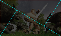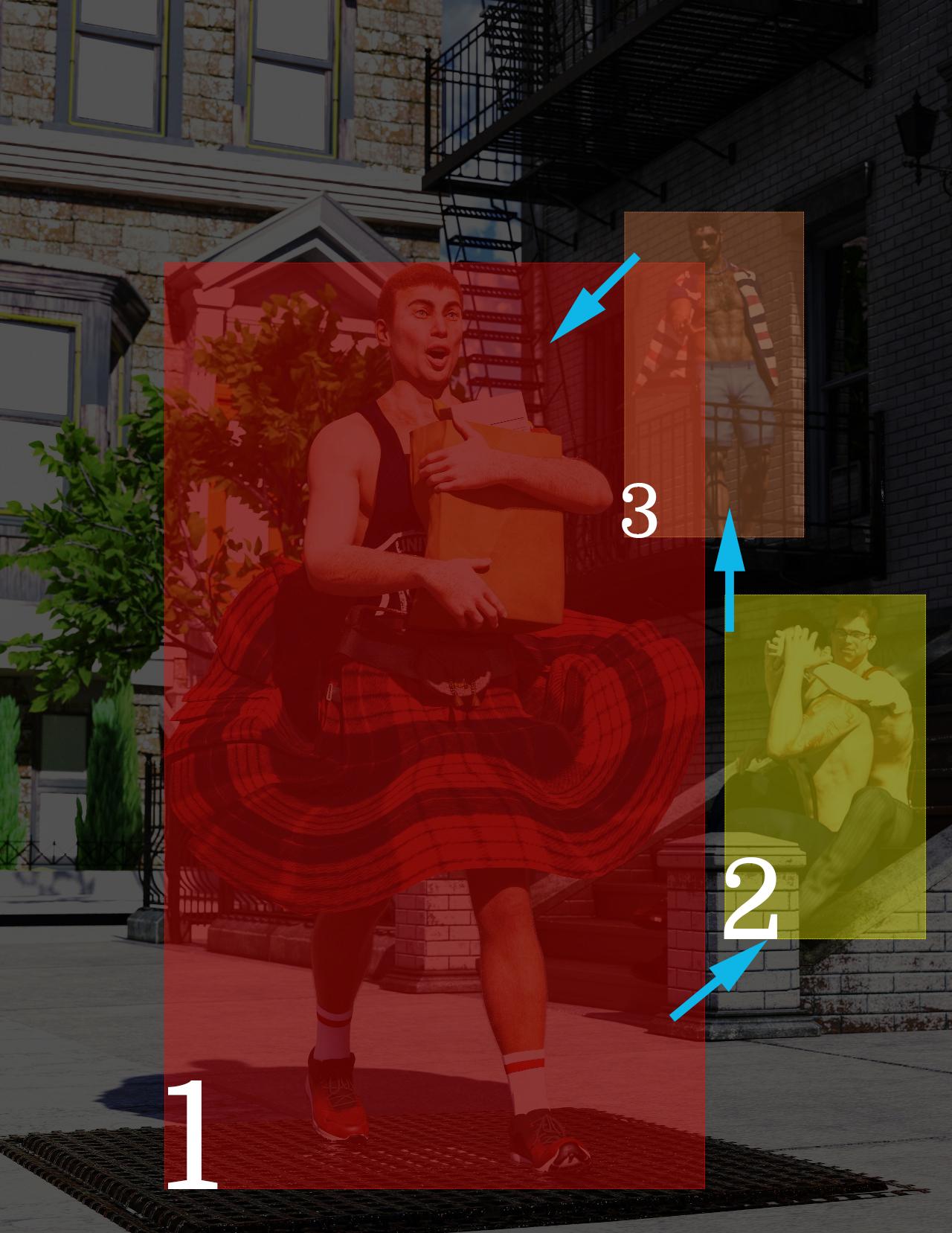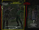 • Beware of where you're cutting your figures... zoom out to avoid cutting the members of one of your figures. - the hairy guy was the culprit, so I moved him a bit. Since he was also pointing off-screen I rotated him a bit, but I now think he should perhaps be pointing more towards the viewer. I also zoomed out, which helped when using the halo to frame the main characters later.