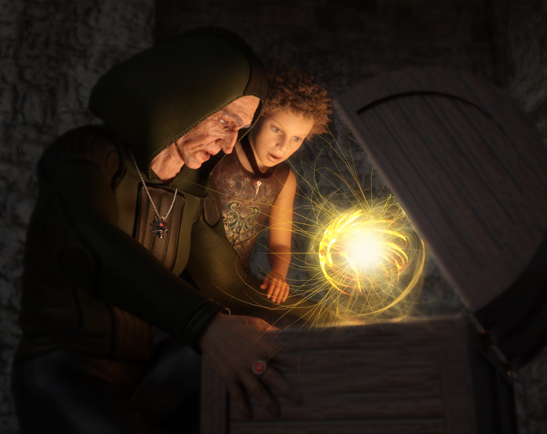 The strongest part of this render is its clarity. It's obvious who is the master and who is the apprentice at a glance. There is also a certain mood of wonderment and enlightenment which is created by the contrast between the soft light emanating from the artifact and the darkness encasing the characters. The warm tint was a great call since it established a sense of comfort, telling us the characters were confronting something wonderous rather than dangerous.