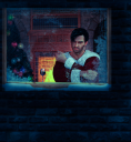 • Another approach is to change things up and show his loneliness via comparison. A way to do that would be to have a couple of people inside that Christmas room, enjoying a good time. You can even blur the window a bit so that you hint at a party without showing it. And then you can place your character outside the building. Now you get the contrast from the lively and warm colors of the inside vs him trekking outside in the cold, with his Christmas gear on but nobody to accompany him.