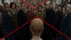 • Mood: Raw pain (you can skip to the one minute mark) | Notice the colors here are cold (blue) and desaturated. Once again we see the sun coming down, but the feeling is quite different from the previous examples. The rain pours and mingles with the characters' tears. And then he falls boneless to his knees, isolated from the rest of the mourning characters.