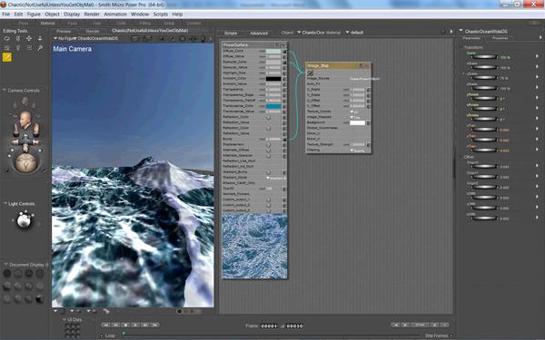 The Poser documents shown are your Ocean Wide Chaotic product exported from DS as an obj file. I’m presenting from Poser Pro 2014. Most of my materials experience in Poser is with 2D texture maps or procedurals provided by a 3P (I am not expert in the info I am presenting here – just trying to respond to your request on troubleshooting). Poser accesses shader nodes through the “material room”. The attached files all show Chaotic obj imported to Poser, the material room selected and various work on nodes informing a root node.