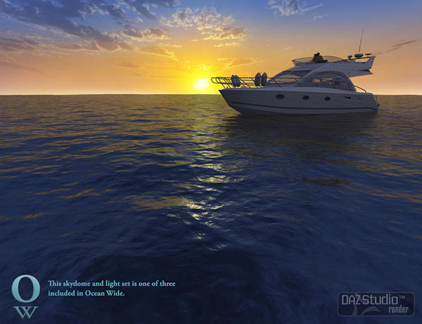 Ocean Wide is a 360 ° environment built for DAZ studio including four huge variable wave ocean props with cameras, two sea foam props, and three skydomes with matching light sets for midday, sunset/rise and night/storm.