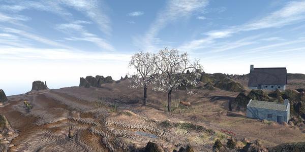 @jamilan: Trees look much better in the second version. I feel like you might want to lighten the grass a little bit, because, together with the trees it makes for a rather dark part of the scene. @adbc: You took quite a difficult task to get all those elements in one piece! I think the horse might be a bit (not much bigger), but the problem is that distance looks to be compressed. For example: the flowers look very big to me, because it looks like they are not very far from the buildings. Then again, the sheep (are these yellow ones sheep?) look small compared to the hare. So: things in front look big compared to things in the back or the distance is larger than it looks. What I tend to do when using different people, animals etc, is first load them at the middle and compare sizes there and then move them. By the way, by increasing the frequency on the material of your terrain, you can probably make the things in the back really look more distant too.
