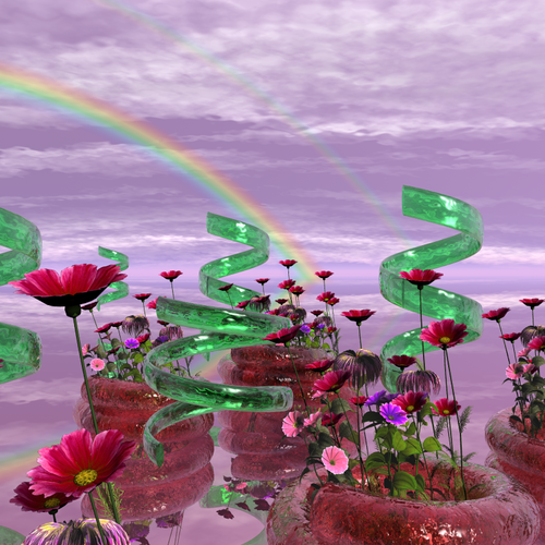 All I used was some default glass shaders and a primitive spring shape that was included with Bryce. The only item purchased that is in the scene is the flowers which is one group I made in Daz then imported in Bryce and I used the instancing lab to randomly rotate them and the springs.