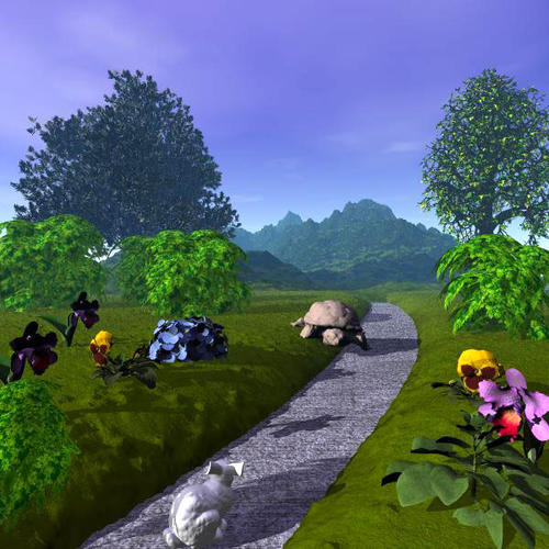 I managed to complete my 3rd entry before the deadline. The tortoise and bunny are from archive3d, the flowers from toucan.com the rest Bryce presets.