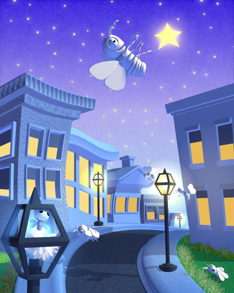 I added the other moths bouncing around with one knocked onto the floor in the bottom right corner. The bulb in the lamp closest to us in the lower left has a bluish color in the glow channel and Aura invoked. The "sparks" are really a Fire Primitive set to Sphere. I also added some weeds and grass. The weeds are very thin cylinders from the Vertex Modeler and tapered using the Model > Deform > Taper tool, then duplicated and each duplicate was gently bent, duplicated again and again to make a clump. The grass is a model I made a while ago that keeps making a cameo in my renders...