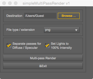 It produces 3 renders, Diffuse, Specular and Mask, and works without a hitch on Win 7. The Script doesn't 'remember' the last used location, which would be handy, and I can't seem to name my renders either, so it asks to overwrite the previous.