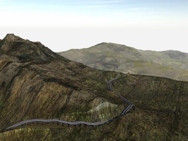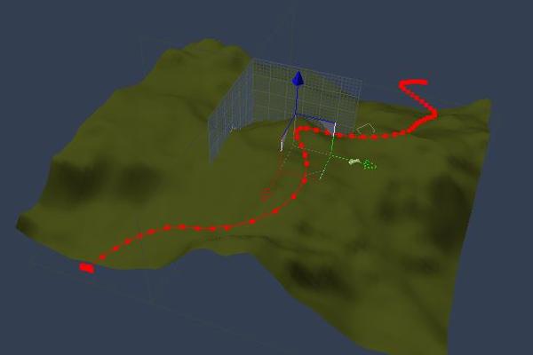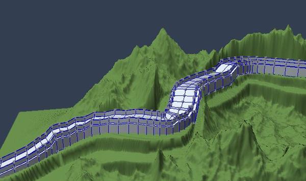 The challenge was to get a smooth curve off the surface of the terrain - couldn't do that after converting the terrain to .obj, so made the terrain in Bryce, which interprets heightmaps more accurately than C. Exported as .obj and used a feature in the VM which is superior to Hexagon - the ability to draw a curve along a surface.