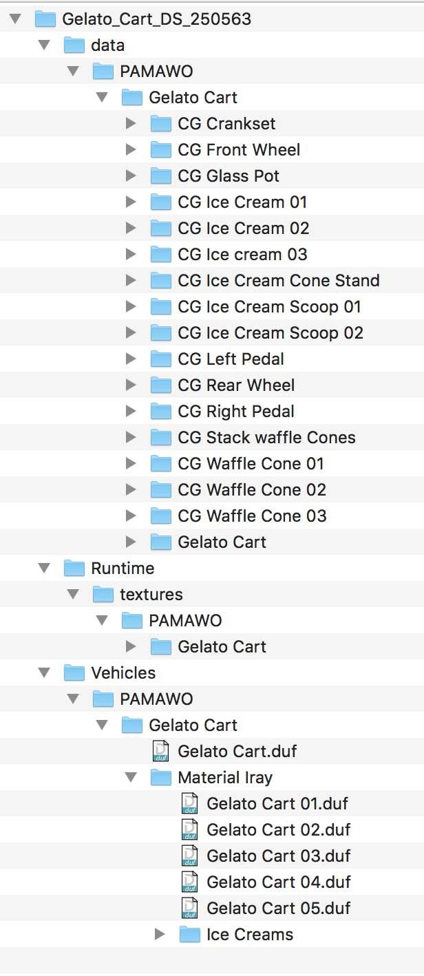 Also, look in your Zip file to see if there is a Props or Vehicles folder (it should have one) and if the Scene Set is there: Gelato Cart.duf