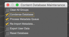 If neither of those is the case, I resort to right-clicking on the Content Library tab, selecting Content DB Maintenance, and selecting the three items checked in the second attached image.