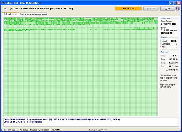 One of the 1½ TB drives was incredibly slow but WD's diagnostics program said everything was fine. I tried everything but wasn't able to find out what the problem was. Eventually I discovered HD Sentinel and a scan revealed an awful lot of weak sectors, which included the area where the MFT is located. See attached report, performance is as you can see very poor in the areas with weak sectors (darker colors).