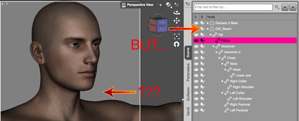 I'm having a weird issue with the beard at the moment. It's... not showing up. I click it, it loads, I get no error messages and there's no issues showing in the log, it shows up in the scene tab but... it doesn't show up in the scene, either in preview or render. It is fit to G2M. I've checked the surface opacity, and it's set to visible in parameters, it's just... not?