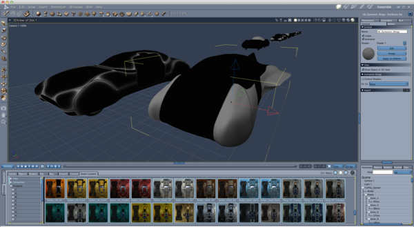 Yes I agree, all you guys are red hot support... unfortunately I don't have TraffKop, just TraffiKar, and none of those models have ever loaded without problems... plus I don't have any sub-directories like yours 3Dage, i.e., "DS and Poser" and/or "Poser 7+". All I have is TraffiKar, and subdirectories of HIRES_08bit, HIRES_16bit, and lores. This is in the Figures directory, btw, and I have nothing for TraffiKar in the Props directory. And so the same problem persists... I just get gray, black, and white blobs of cars... The first pic shows just that. I dragged first the default "TraffiKar" from the far right of the browser into the scene, and then the "Teardrop" model from the far left. And it just keeps getting weirder. Inexplicably now, the TraffiKar shows some details where it never had before, while the Teardrop stays to its blobby state. I can't help but think the "TraffiKar" is some kind of base model that you can then inject morphs into and apply mats and such to get the other styles of cars... but then... if that were the case, why would they include all these other car shapes in the content browser, just to have them *not* work. (In Carrara anyway, I understand it wasn't really made for Carrara in the first place). So I headed to the Pose directory, and started slapping mats on a couple of cars, er, kars... You can tell what I dragged onto the models as I left them highlighted for the grabs. Anyway, all that did was make the default TraffiKar worse, and didn't make much of an improvement on the Teardrop one. Also I found this link -> http://docs.daz3d.com/doku.php/public/read_me/index/9276/start - but again I'm afraid I'd have to have you guys "translate" this for me in terms of how it would apply to Carrara's workflow. And on that page are both the pdf manuals for Poser and Daz.... I have to admit after 3Dage's effortless work, I feel *extra* dim :-/ But also, continuing thanks for the hard work guys!