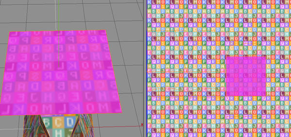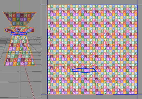 To demonstrate this in one image you can see some stretching where I've scaled up one edge of the model, the alphabet image shows the stretching that results. Some models may arrive with stretching on them (depending on the unwrapping method you've used) and such scaling of edges or faces or just moving a vert in the UV Editor window may help to relieve this stretching.